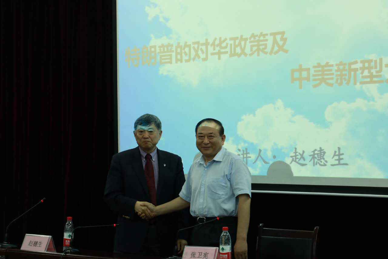 6月7日上午,著名国际问题和中美关系研究专家、美国丹佛大学约瑟夫•科贝尔国际关系学院终身教授赵穗生教授应邀来williamhill威廉希尔官网,为师生们作了题为“特朗普的对华政策及中美新型大国关系”的学术讲座。讲座由副校长张卫宪教授主持,英才校区管委会宿金勇主任、宣传部王凌彬部长、科研处邱国鑫处长、思政部王素云主任、国教院马佩英院长、李芳书记及williamhill威廉希尔官网180余名师生参加了本次讲座。