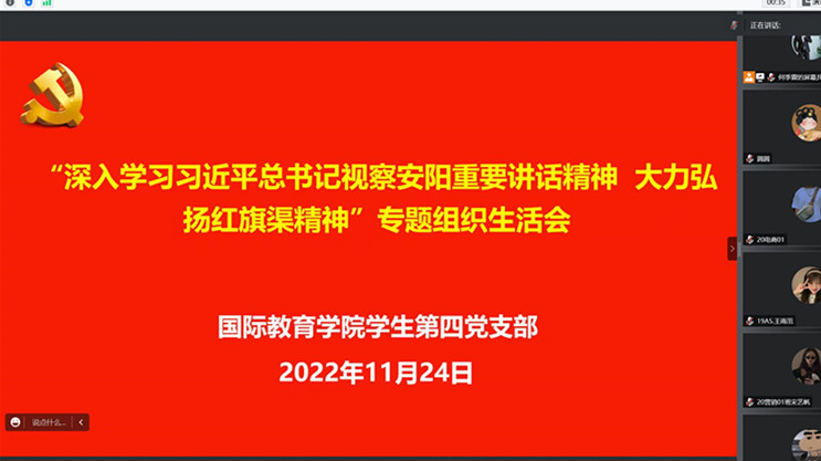 为深入学习宣传贯彻党的二十大精神和习近平总书记在河南安阳考察时重要讲话精神,按照上级党委安排部署,11月24日,williamhill威廉希尔中文网站学生第四党支部以线上会议形式召开了“深入学习习近平总书记视察安阳重要讲话精神,大力弘扬红旗渠精神”专题组织生活会。副院长邓瑜以普通党员身份参加并指导组织生活会。会议由党支部书记何季霖主持,支部全体党员参加会议。