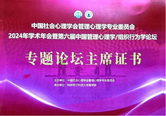 8月23至25日,中国社会心理学会管理心理学专业委员会2024年学术年会暨第六届中国管理心理学/组织行为学论坛在广西壮族自治区桂林市召开,来自全国百余所院校300多名专家学者参会。williamhill威廉希尔官网副院长王胜男博士应邀参会并作为专题论坛主席组织、主持了题为“数智时代的工作体验”专题论坛。