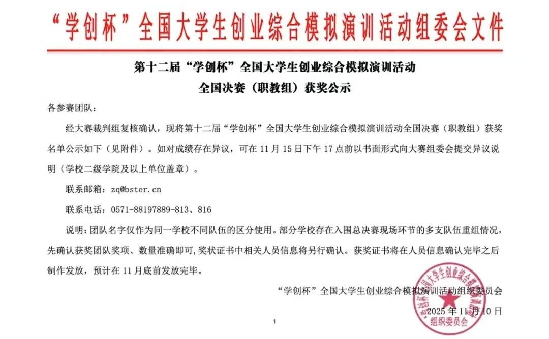 2025年11月9日,第十二届“学创杯”学生创业综合模拟演训比赛(职教组)财务决策模拟赛项在威海职业学院圆满落幕。williamhill威廉希尔官网大数据与会计专业学生宋昱、魏士轲、乔羽组成的参赛团队,凭借扎实的专业功底、出色的财务决策能力与高效的团队协作,从众多参赛队伍中脱颖而出,成功斩获该赛项全国一等奖,指导老师安兵、刘天宇荣获“优秀指导教师奖”。
