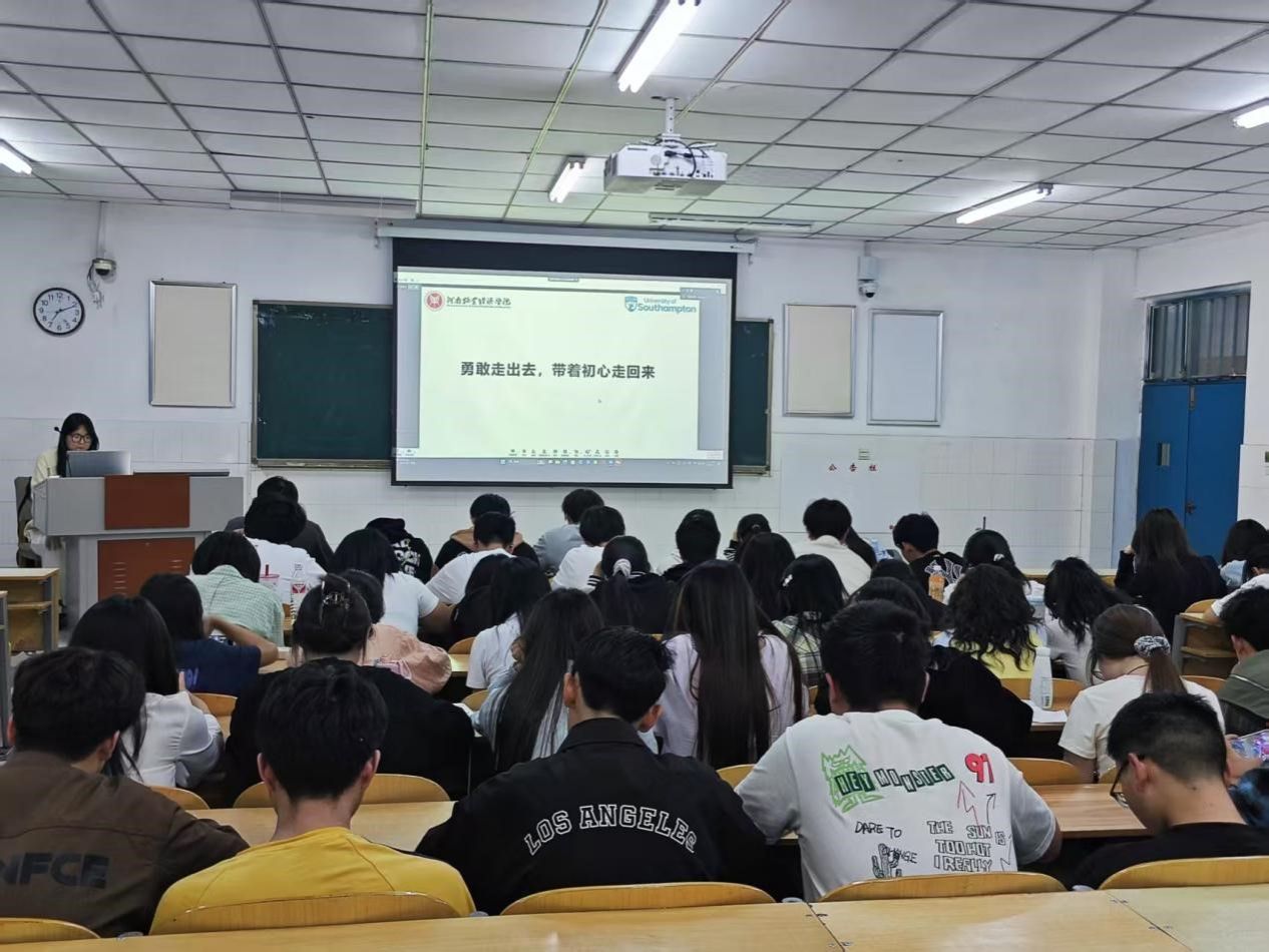 本次活动邀请学院优秀毕业生,目前分别在匈牙利布达佩斯经济科技大学攻读硕士学位的徐畅、英国南安普顿大学攻读硕士学位的侯怡帆、爱尔兰东南理工大学攻读硕士学位的马铭杨担任主播,以“我的一天”vlog的方式展现留学生海外求学、生活的真实情景。从校园漫步到城市探索,从节日庆典到日常生活,一帧帧画面记录着他们在海外的精彩瞬间。这些vlog不仅展现了他们留学生活的多彩风貌,还体现出同学们在视频拍摄、剪辑及文案创作方面的才华。现场气氛热烈,同学们被视频中的异国风光和有趣故事深深吸引,不时发出阵阵惊叹。随后,三位留学生通过线上连线的方式与同学“云端”相见。他们结合亲身的经历,分享在异国他乡的点点滴滴,从紧张充实的学习生活,到丰富多彩的课外活动,再到面对挑战时的成长与蜕变,让在场同学身临其境,深切感受到不同国家的文化氛围和教育特色。
