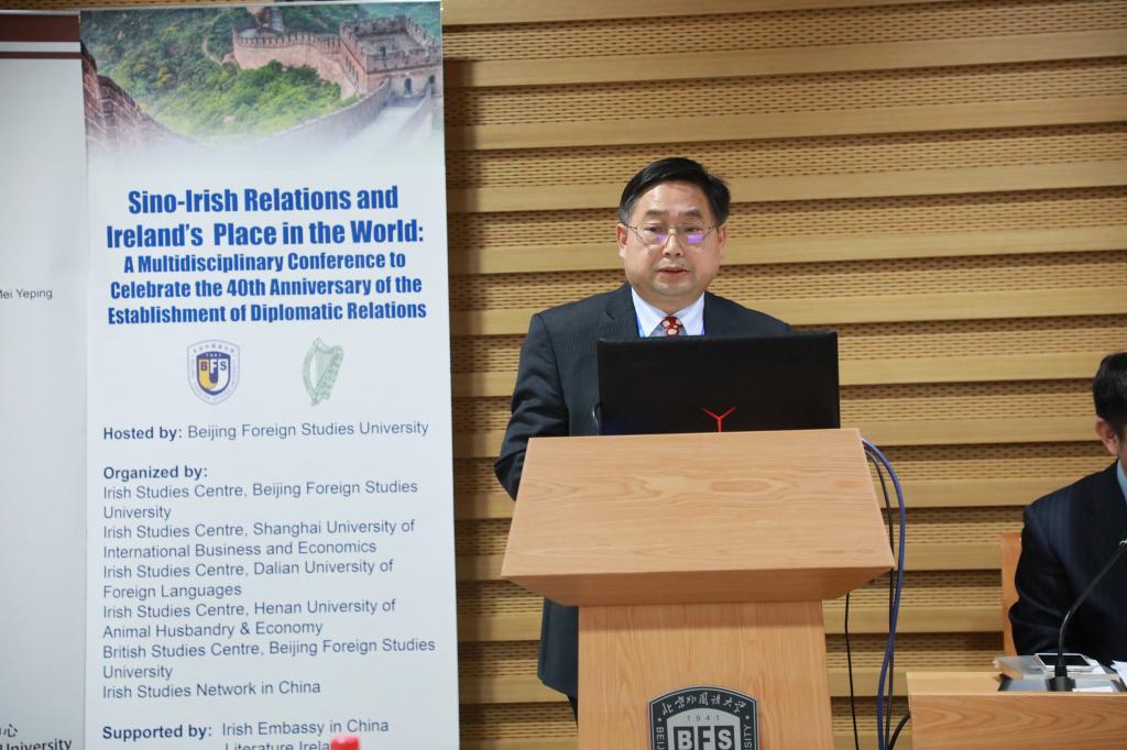会议开幕式由北外英语学院副院长、爱尔兰研究中心主任王展鹏教授主持,北外校长杨丹教授、爱尔兰驻华大使李修文先生、中国前驻爱尔兰大使刘碧伟先生、及罗士喜校长先后致词。罗校长简要回顾了中爱建交四十年的发展历程,指出在国际形势日渐复杂的当今,中爱两国应挖掘古老文明的智慧,展现两国的历史担当,共同推动构建相互尊重、公平正义、合作共赢的新型国际关系,共同推动构建人类命运共同体。