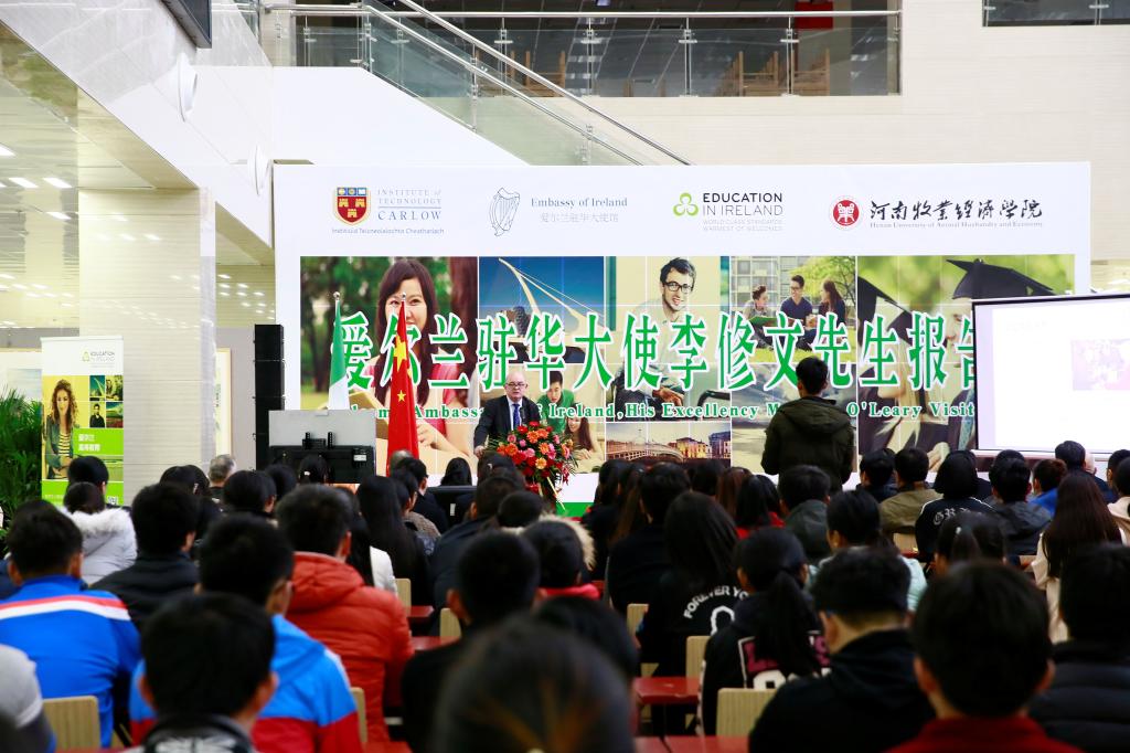 揭牌和签约仪式结束后,李修文一行参观了williamhill威廉希尔官网校史馆,并为williamhill威廉希尔官网师生做了精彩的主题报告。罗士喜向客人介绍了williamhill威廉希尔官网发展历程、williamhill威廉希尔官网与爱尔兰卡罗理工学院合作办学情况,以及爱尔兰研究中心成立的背景。李修文介绍了爱尔兰的基本国情、近年来爱尔兰的发展变化及教育在国家发展中的作用。戴克澜•道尔介绍了卡罗理工学院的地理位置、学习环境、优势专业等,鼓励williamhill威廉希尔官网学生前往卡罗理工学院继续深造。